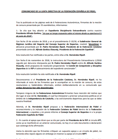 Padel World Press - La Federación Española de Pádel (FEP) ha emitido un comunicado este martes contestando a la moción de censura presentada por 25 asambleístas la pasada semana.