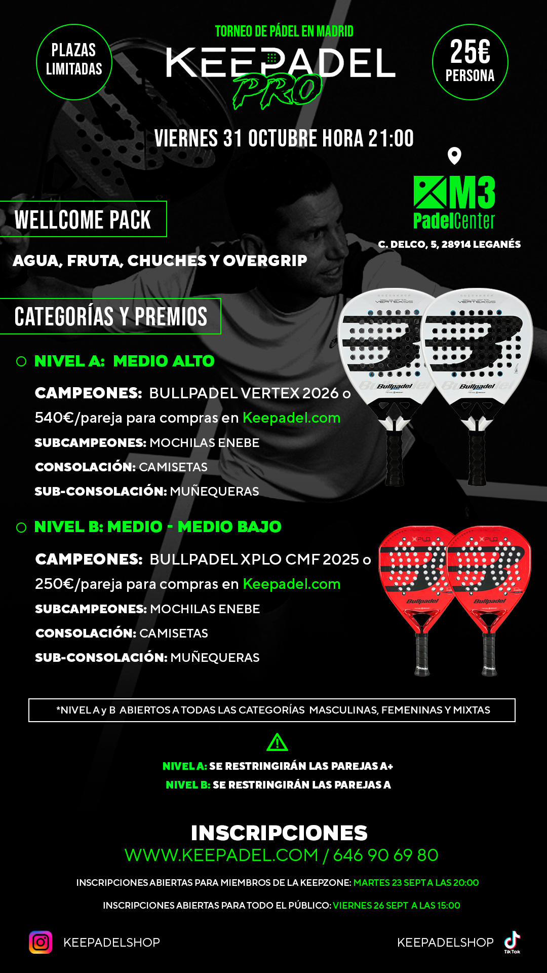 Padel World Press – El próximo viernes 31 de octubre, el M3 Pádel Center de Leganés se vestirá de gala para acoger una nueva edición del Keepadel Pro Nocturno, un torneo que se ha convertido en referencia para los amantes del pádel de la Comunidad de Madrid. Organizado por Keepadel, este evento nocturno destaca por su cuidada organización, su ambiente selecto y unos premios que marcan tendencia en el circuito amateur.