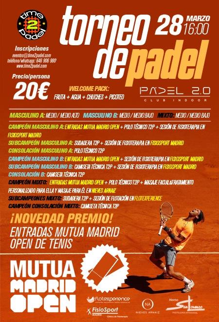 El mes de marzo entra en su recta final y, si comenzó con mucho pádel… ¿Qué mejor que terminarlo de la misma manera? No te quedes fuera de un torneo que, el sábado 28 de enero y desde las 16:00 horas, el equipo de Time2Pádel organizará en uno de los clubes de referencia de la Zona Sur de Madrid… ¡¡Y que tendrá unos premios sin igual!!