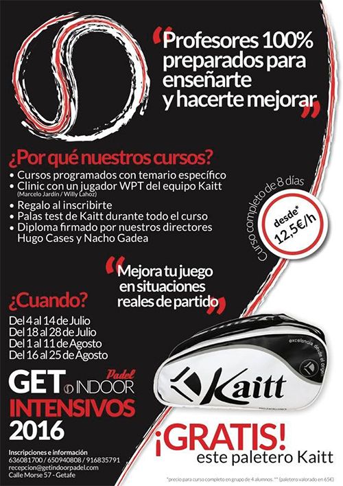 Padel World Press .- El equipo de GET Indoor ha presentado sus nuevos Cursos Intensivos 2016. Siempre dispuestos a sorprender a sus socios y clientes con las mejores alternativas para disfrutar del pádel, en esta ocasión han centrado todos sus esfuerzos en conseguir que los meses de verano tengan un nuevo aliciente para los practicantes de este maravilloso deporte.